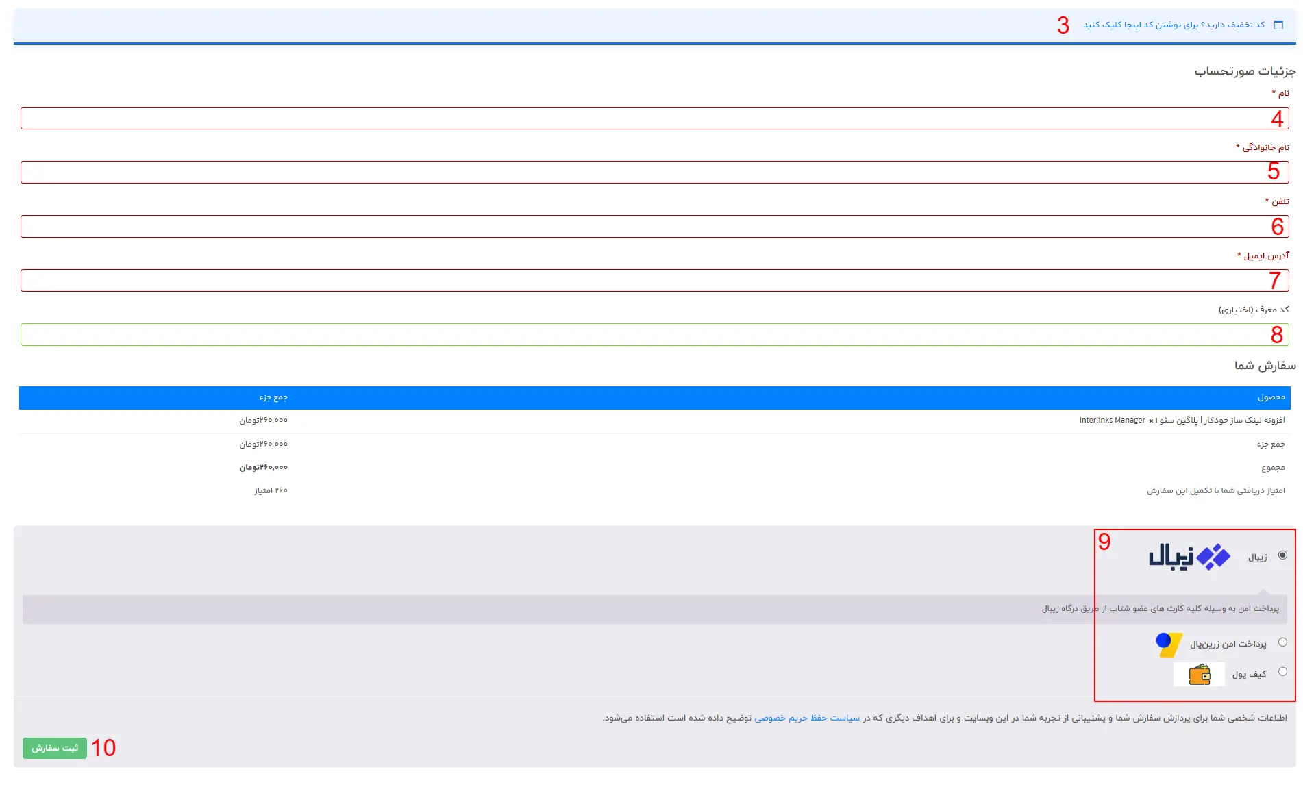 در این بخش، در صورت داشتن کد تخفیف، آن را وارد کنید تا تخفیف روی مبلغ نهایی اعمال شود.
